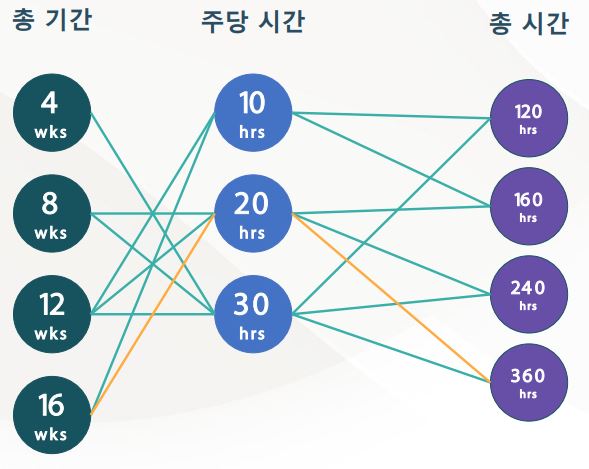 -온라인 인턴십만 가능한 특장점! 채팅이나 이메일을 통한 로그인으로 근태 관리 + 주간 미팅 진행 자율적 스케줄 관리 활용으로 업무 진행 4주-16주, 최소 120시간-최대 360시간 기간 및 주당 근무시간은 아래와 같이 자유롭게 선택할 수 있습니다.